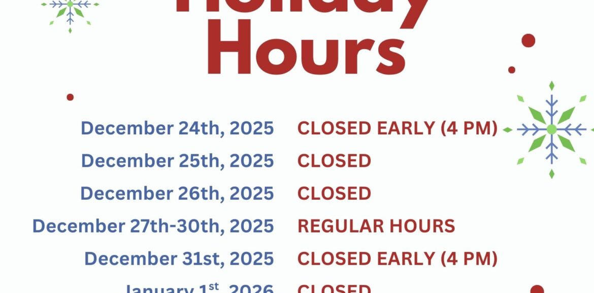 As the holiday season approaches, we would like to share our adjusted hours of operation for late December and early January. Please review the schedule below and plan sessions, appointments, and communications accordingly.